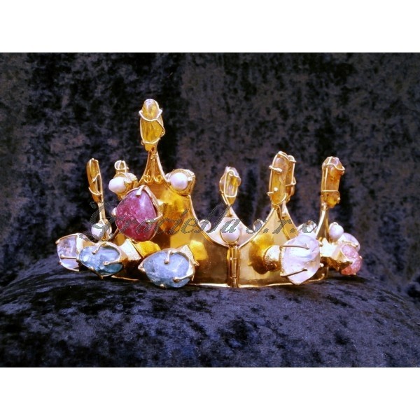 Pozlacená koruna s dynamickými gotickými prvky. Koruna je ozdobena jantary, křišťály, perlami a křemeny.