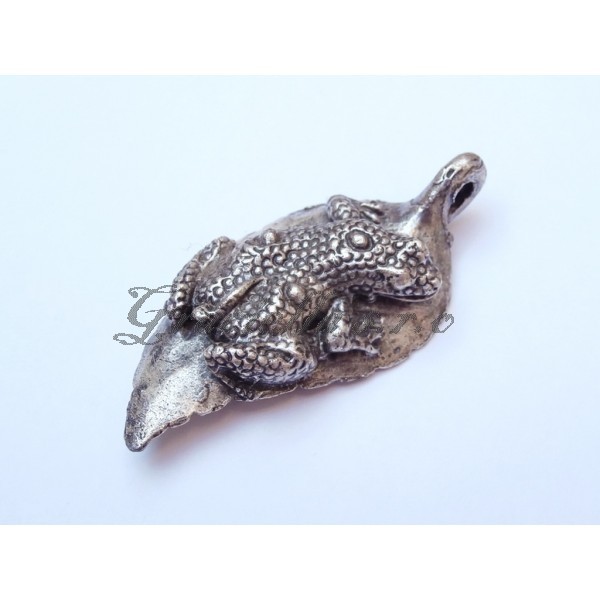 Cínový přívěsek ve tvaru žabky sedící na listu. Velikost cca 6 cm.
