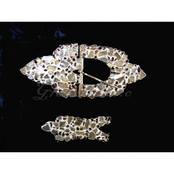 Pozlacená opasková spona s nákončím vykládaná olivíny a granátky.